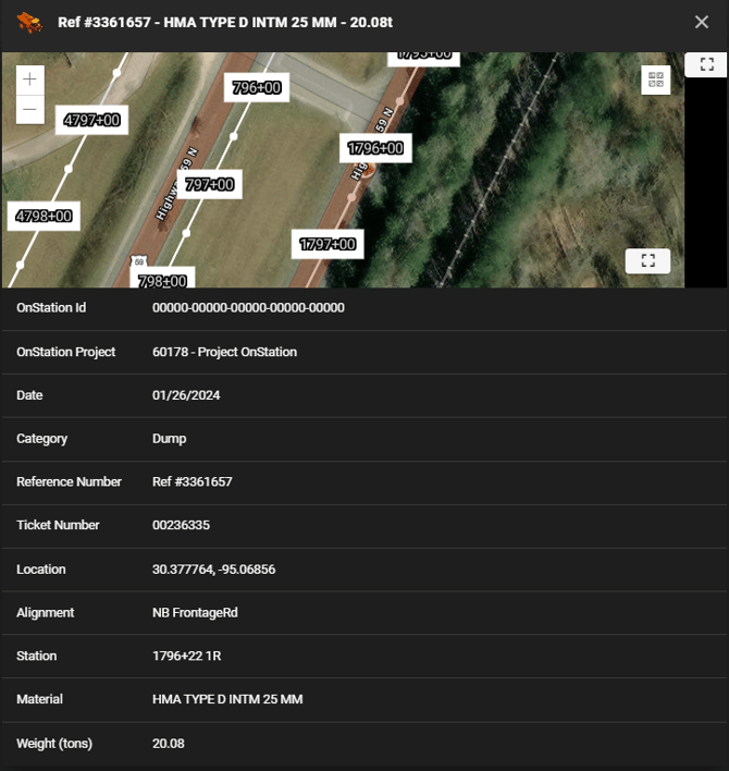 Clicking on "view" for the line item of interest will display that material dump ticket information detail.