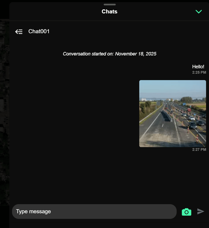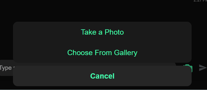 - Send a photo to the chat by taping the camera icon at the bottom of the page. You can take a photo or select a photo from your gallery.
