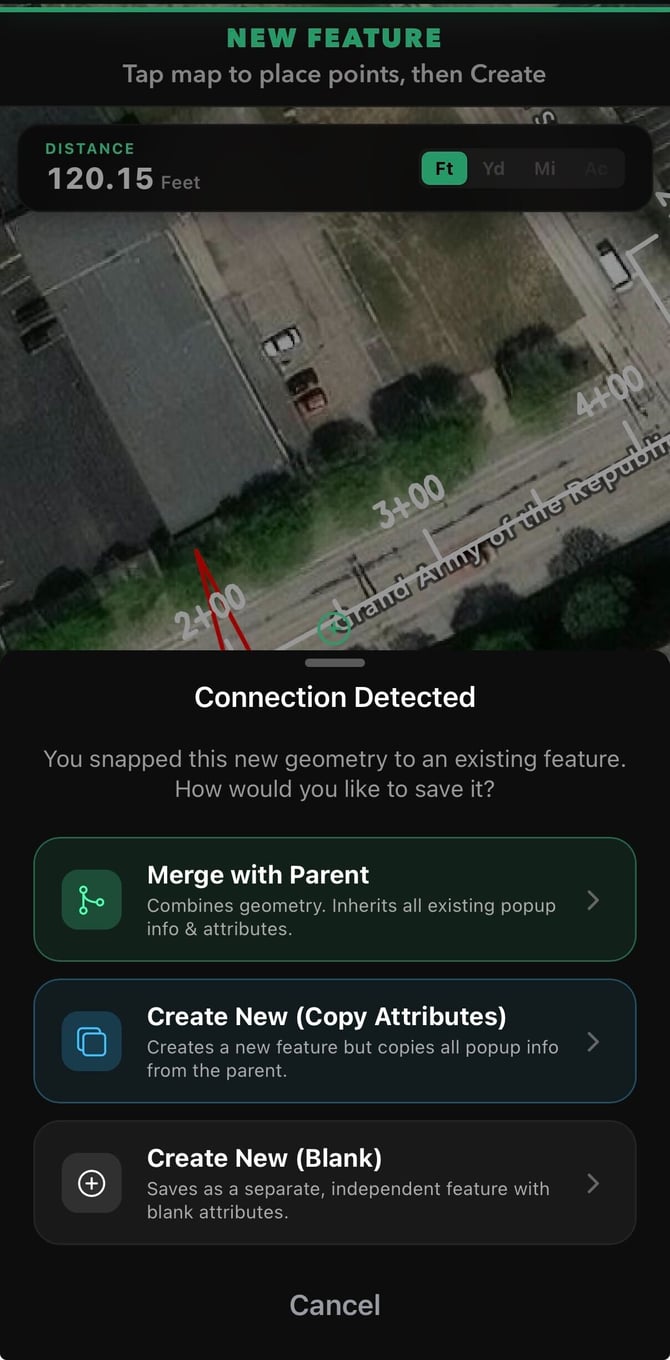 - OnStation will recognize the snapping feature and allow you to assign attributes to the new feature based on the connecting feature.