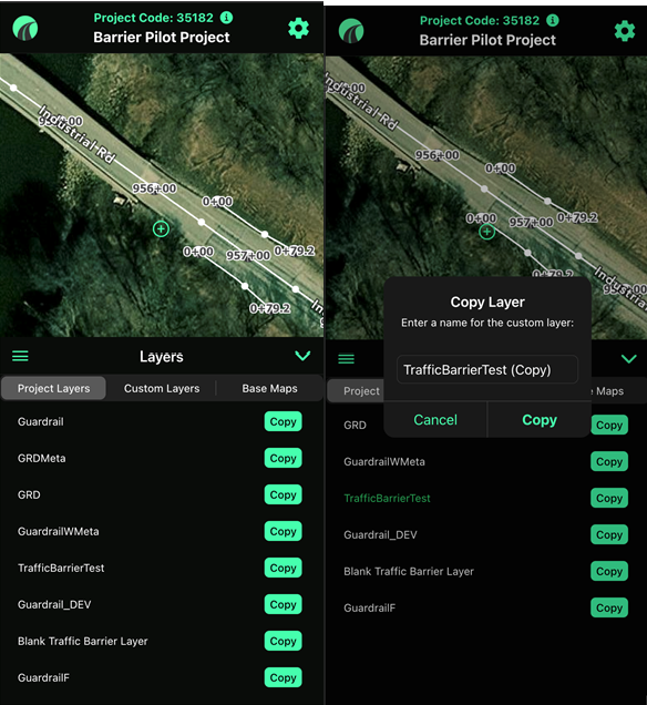 Users can copy project layers that are not Vector Tiles (only Stationing layers usually) by clicking “Copy” and naming the layer to the new name desired. This Copy will reside in a new section in the Layers menu entitled "Custom Layers". These Custom Layers will allow users to: