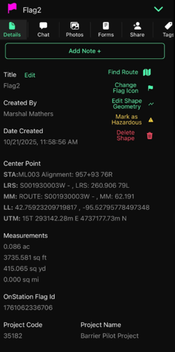 - After dropping the flag, the details page will appear where you can add a tag, form, photo, pay-line items, or create a chat and share your shape.