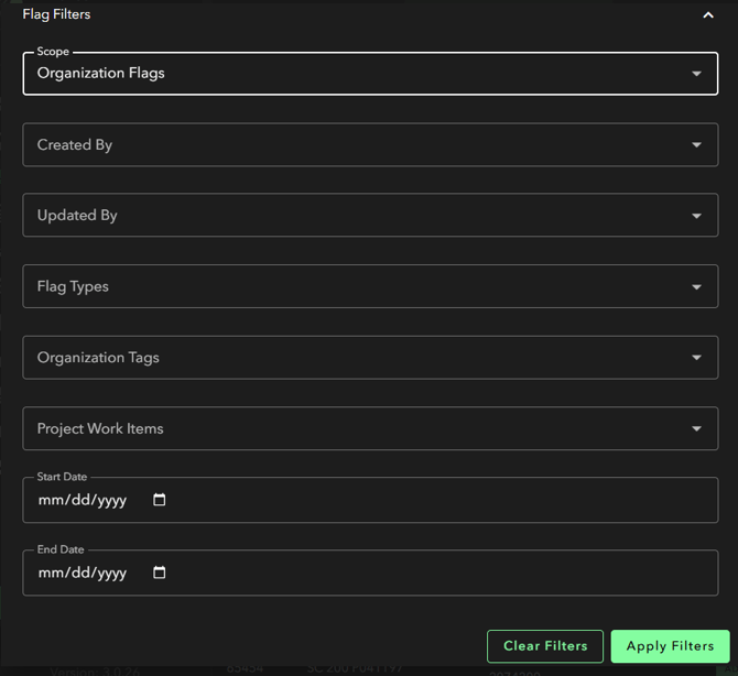 - Clicking in the Flag Filter on My Organization - All Flag Types will reveal the option to customize your form query by Scope, Created By, Updated By, Type, Tags, Work Items and/or Date Range