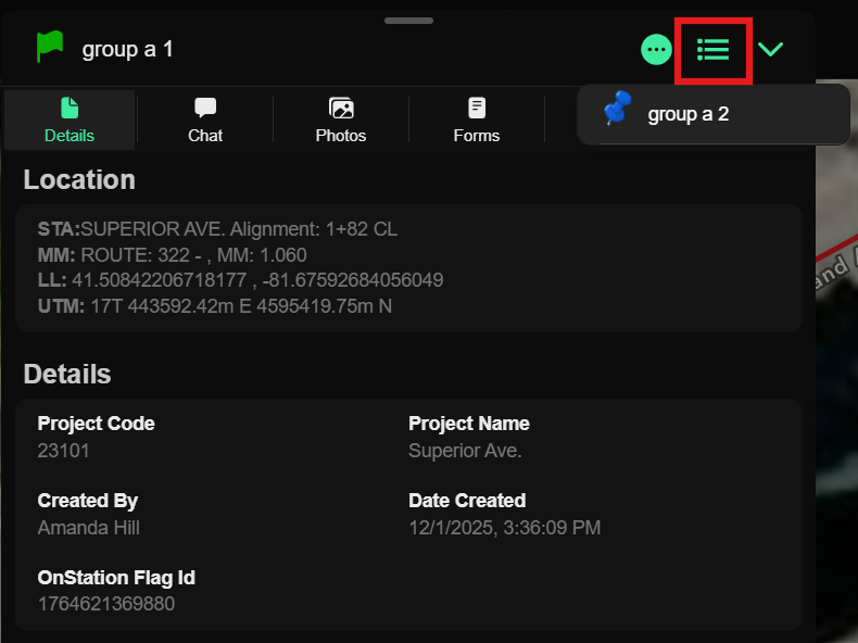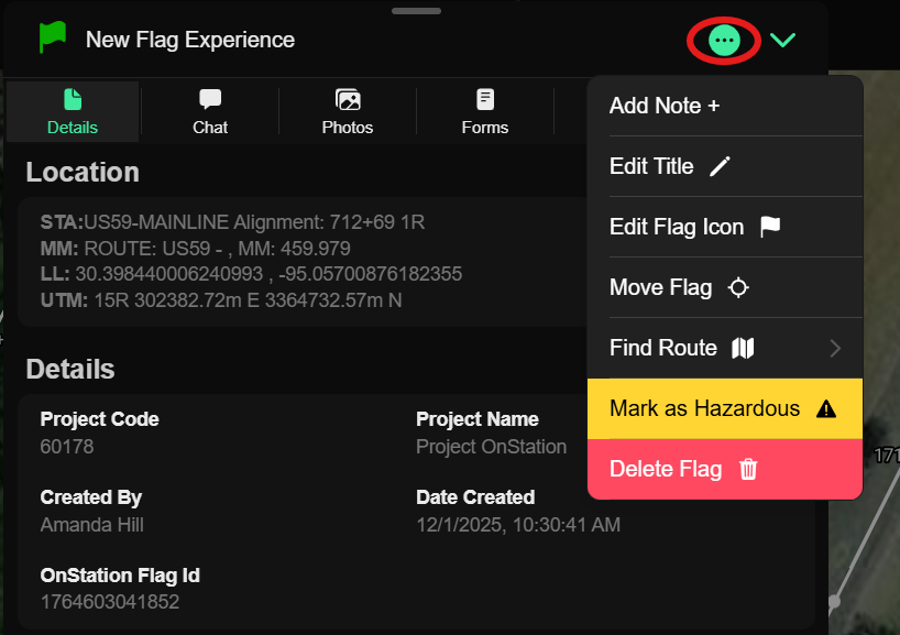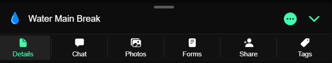 Just like before, the top of the flag page lists tabs to find the details, chat, photos, forms, share, and tags.