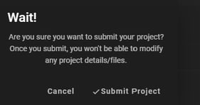 5. You will  then get a second prompt asking you to confirm your submission.  It will read: "Wait! Are you sure you want to submit your project? Once you submit, you won't be able to modify any project details/files."  You will then be able to click Cancel or Submit Project.