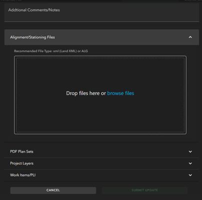 3. Upload the applicable project revision files for the Alignment /Stationing, PDF Plan Sets, Project Layers, and/or Work Items/PLI as needed
