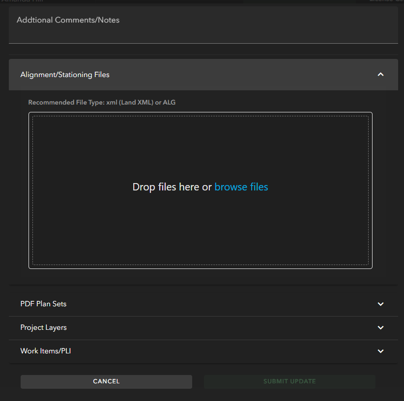 - Upload the applicable project revision files for the Alignment /Stationing, PDF Plan Sets, Project Layers, and/or Work Items/PLI as needed