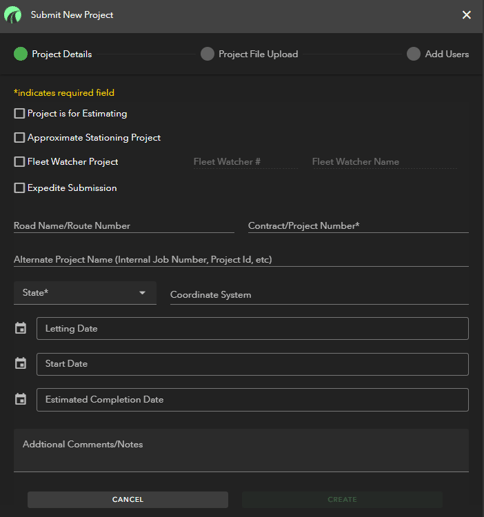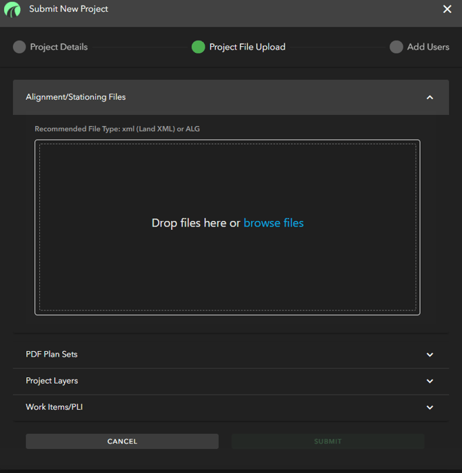 Category File Type Alignment / Stationing files xml (Land XML) or ALG PDF Plan Sets PDF Project Layers DGN, DWG, DXF Work Items / PLI Excel or txt - Once you have uploaded all of your files into the applicable section, and you have added any additional persons you want to be notified of project release, you will then want to click "SUBMIT"